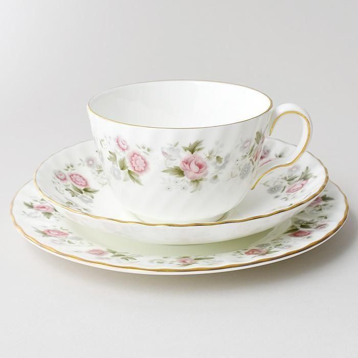 このトリオはミントン社のスプリングブーケ(春の花束)というパターンで、1987年に販売された比較的新しいパターンです。淡い優しいピンクのバラをモチーフにした、いかにもミントン社らしい上品な絵柄です。